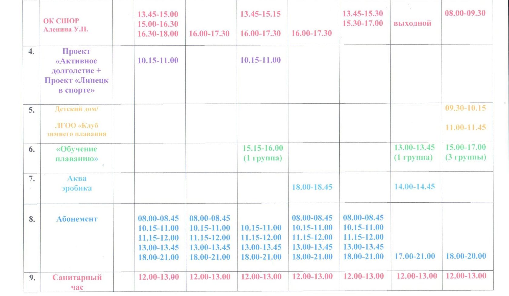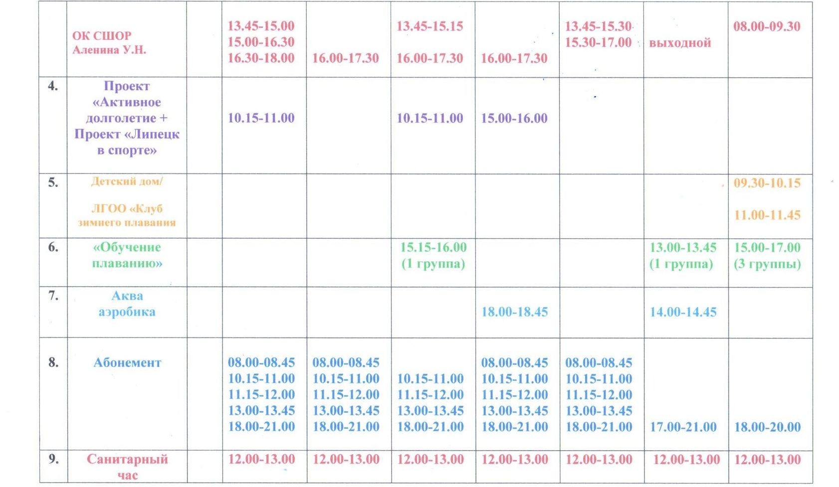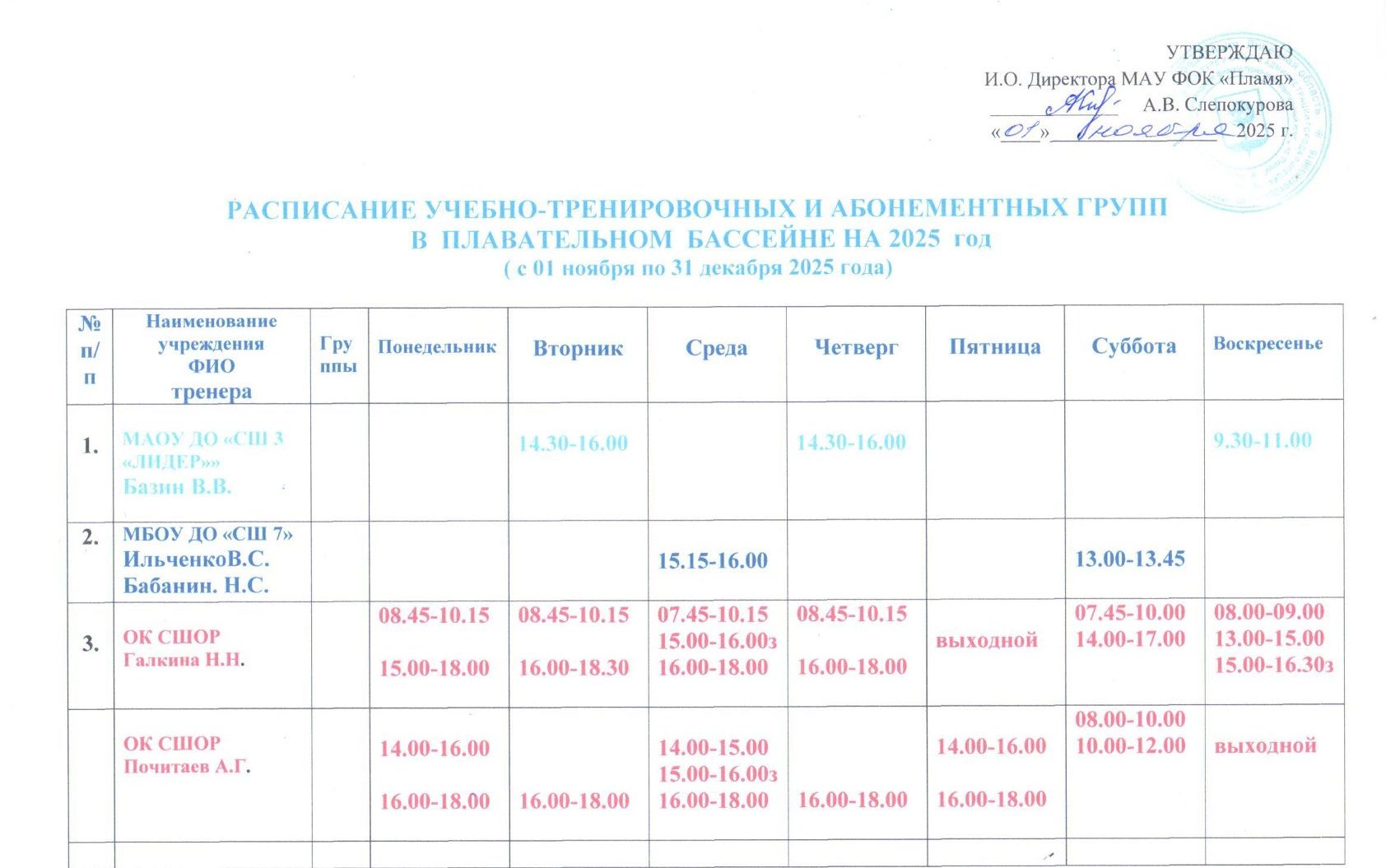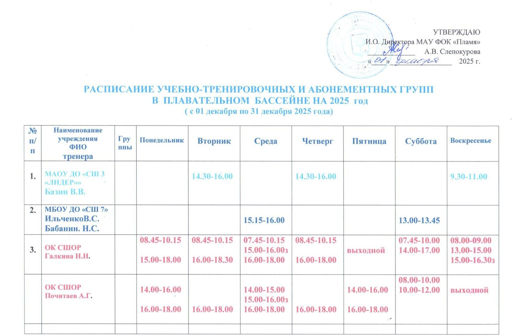 РАСПИСАНИЕ ЗАНЯТИЙ В ПЛАВАТЕЛЬНОМ БАССЕЙНЕ НА 2025 ГОД