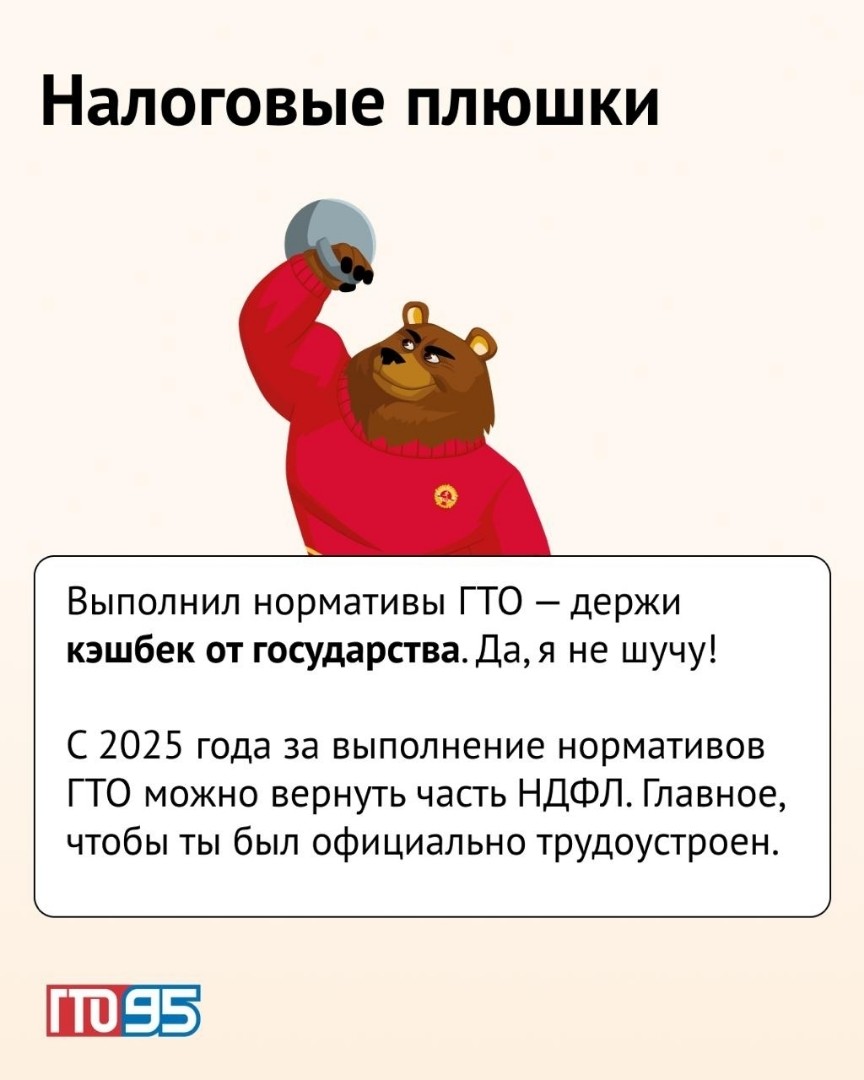 С 1 января 2025 года, по инициативе Президента Владимира Путина, ГТО даёт налоговый вычет по НДФЛ до 13%. Стоит отметить, что налоговый вычет доступен исключительно для официально трудоустроенных граждан, которые регулярно уплачивают налог на доходы.
